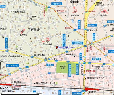 ①環状八号線通りを北上し(四つ目の信号)千川通りを左に入る。②千川通りに入ると一つ目の信号(スーパー/ヨークマートを目標)を右に入る。③信号を右に入ると約100m先T字路を左に入り約100m先突き当りの右側が株式会社ワットです。